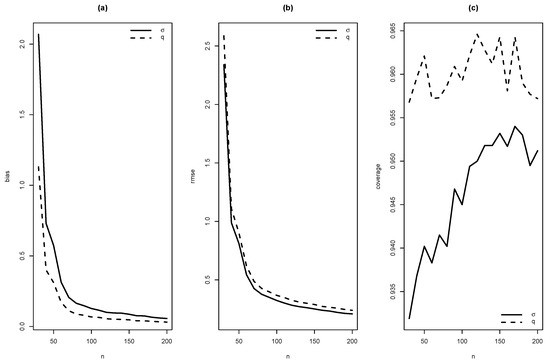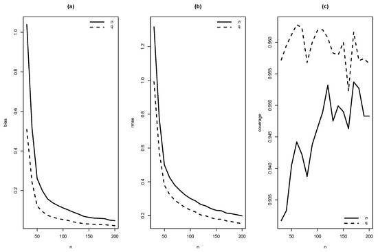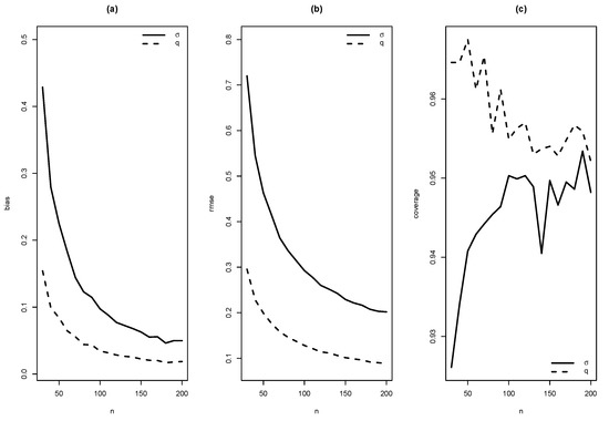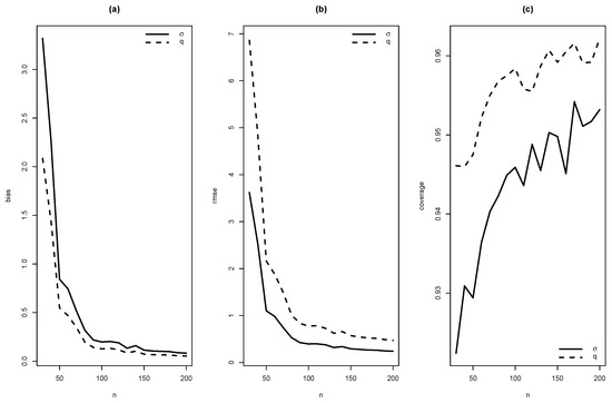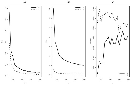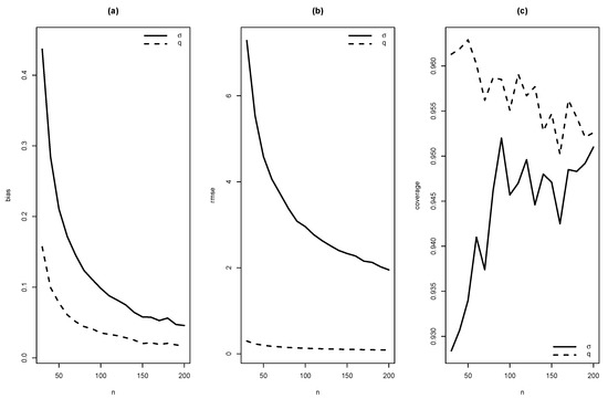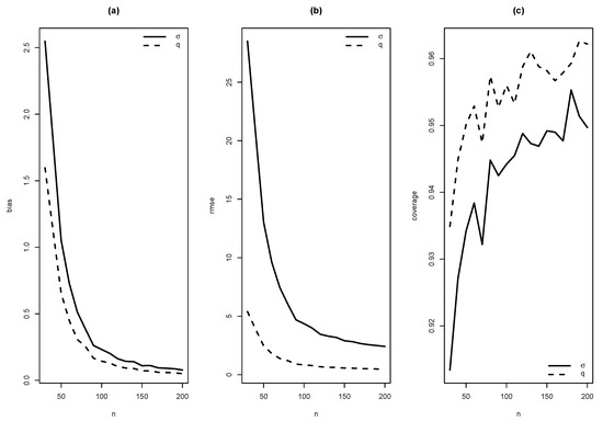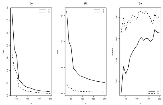 Graphics of (a) bias, (b) RMSE and (c) coverage of simulation for , with .