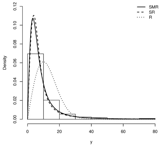 Table 2 provides the ML estimates of parameters and their standard errors in parentheses for SMR, R and SR models. These models are compared by using the Akaike Information Criterion (AIC), Akaike [20] and the Bayesian Information Criterion (BIC), introduced in Schwarz [21]. Both criteria reveal that the SMR model provides a better fit to this data since their values are less than the others.