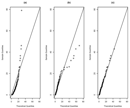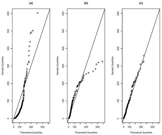 QQ-plot for distributions (a) R, (b) SR, (c) SMR for the remission times of patients with bladder cancer.