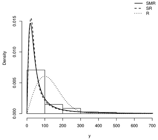 Figure 12 depicts the histogram of this dataset along with the estimated pdf for R, SR and SMR distributions. Moreover, Figure 13 provides the corresponding QQ-plots for these models. Note that the QQ-plots for R and SR models show that these distributions does not provide a good fit on the right tail of these data. However the QQ-plot for the SMR distribution does not exhibit this drawback.