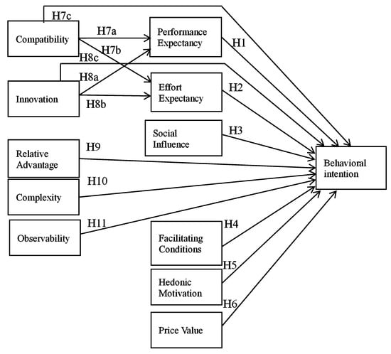 Rogers [] defined compatibility as the degree to which an innovation is in line with the existing personal values and experience of a potential user; when an innovation provides a product or service, the potential user may accept the product or service if the user can effortlessly learn or change existing use behavior. In using a mobile payment system, users only need to understand operating process and application blocks, while the payment methods used by users remain unchanged. Relative advantage is defined as the degree to which an innovation is believed to be better than existing products, meaning a potential user could obtain economic and social advantages if the innovation is undoubtedly favorable []. Potential users will realize that a new product or service is more favorable and useful than existing similar products or services, and they will expect themselves to accept the product or service provided by the innovation. Furthermore, relative advantage also refers to the degree to which an innovation provides more benefits, and improves efficiency, economic benefits, and status []. Complexity is defined as the degree to which an innovation is believed to be difficult to understand and use, and when an innovation is too complicated, potential users need more related knowledge and instructions to operate or understand the product or service. Observability is defined as the degree to which the results of an innovation can be observed by others []. Chakravarty and Dubinsky [] believed that an innovation that is hard to observe is subject to potential diffusion and adoption issues; therefore, an innovation should attract the attention of target users for the purpose of allowing them to understand the service. In view of the above literature review, Hypotheses H7a to H11 are proposed.