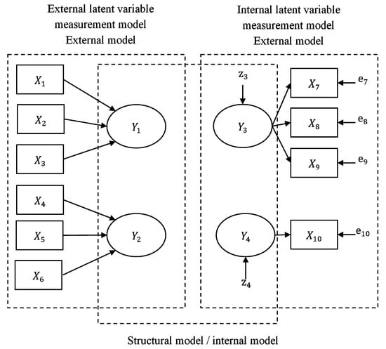 In path models, the constructs are the variables that cannot be directly predicted, and the circles represent Y1~Y4. Indicators, also known as manifest variables, are proxy variables that are obtained by directly measuring the original data, and the rectangles represent X1~X10. The relationship among the constructs and the relationship between the constructs and their indicators are represented by arrows. In PLS-SEM, the single-headed arrows represent a directional relationship, indicating that the predictive relationships among variables can be supported by sufficient theories and can be interpreted as causal relationships.