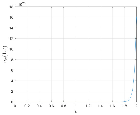 In this section, we exhibit simulation results for both open- and closed-loop dynamics of the PDE system (13)–(15). The aim is to show that the Neumann stabilizing controller (126) applied at the boundary condition (15) achieves boundary control of the R-A-D system. The open-loop dynamic behavior is that for which . The parameters for the PDE (13), and for which the code was executed, are and with initial condition . Figure 1 shows the open-loop dynamic behavior of the R-A-D system from which it can be seen that the system is unstable. From Figure 2, it can be seen that the closed-loop response from the boundary control of the PDE system the controller makes of this PDE system a stable one. Figure 3 shows the open-loop response behavior at the right boundary for . Figure 4 shows the control effort when applying the Neumann stabilizing controller (126) at the right boundary of the R-A-D system in order to implement the closed-loop system. From Figure 4, it can be seen that the control effort is bounded.
