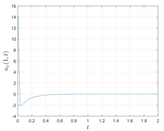 as target system, as it is usual in boundary control of PDEs [14] due to its physical motivation [4], but with Neumann boundary conditions for a function defined in the spatial variable and time . In the following, we must prove that the target system (24)–(26) is exponentially stable in the sense of the -norm of the state with respect to the spatial variable limited to the unit domain. The -norm is defined by