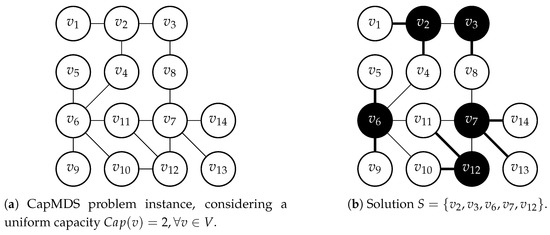 Figure 1 presents an illustrative example of the CapMDS problem. While Figure 1a displays an example graph, Figure 1b shows an optimal solution (black vertices) considering a uniform capacity of 2 for each vertex. Notice that the sets of dominated neighbors of each node in S are indicted by bold edges. Vertices and , for example, form set . More specifically, and , , , , .