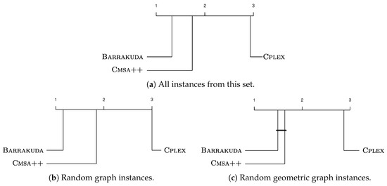 In addition to Cplex, Cmsa++ and Barrakuda were applied with the corresponding parameter values from above to all problem instances exactly once. The time limit for each run was set to 1000 CPU seconds for each algorithm. The results for the problem instances from the literature are presented in numerical form in Table 5, Table 6, Table 7 and Table 8. Each table row contains the solution quality (columns with heading ) and the time at which this result was obtained (columns with heading ) averaged over 10 problem instances for each of the three algorithms. Moreover, we show the results of LS_PD, which is an algorithm based on a local search that was the state-of-the-art approach for the CapMDS problem before the publication of Cmsa. In addition to solution quality and computation time, in the case of Cmsa++ and Barrakuda we also provide the average gap (in percent) over the respective 10 problem instances, either with respect to the optimal solutions obtained by Cplex, or—if not possible—with respect to the optimal MDS solutions of the respective problem instances. In the former case, the gaps are marked by a superscript ‘’a”, and in the latter one by a superscript ‘’b”. Those cases in which not even the optimal MDS solutions could be computed (due to excessive computation times) are marked with ‘’– –”. The best results per table row are indicated in bold font. Moreover, the result of Cplex is shown with a grey background in case the result is proven optimal. Finally, results with a preceding asterisk indicate new best-known results. In order to summarize these results, we additionally generated so-called critical difference (CD) plots for subsets of these problem instances (see the graphics in Figure 4). For their generation, first, the Friedman test was used to compare Cplex, Cmsa++ and Barrakuda simultaneously. (LS_PD was not included in the critical difference plots because, unfortunately, the detailed results per instance were not available. In any case, LS_PD is clearly worse than the other three techniques.) The hypothesis that the techniques perform equally was rejected. Subsequently, the algorithms were compared pairwise by the Nemenyi post-hoc test [36]. The obtained results can graphically be shown in the form of the above-mentioned CD plots in which each algorithm is placed on the horizontal axis according to its average ranking for the considered subset of problem instances. The performances of those algorithm variants that are below the critical difference threshold (computed with a significance level of 0.05) are considered as statistically equivalent. Such cases are shown by additional horizontal bars joining the average ranking markers of the respective algorithm variants. (The statistical evaluation was conducted using R’s scmamp package [37], available at https://github.com/b0rxa/scmamp.)