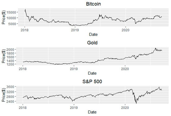 Note that to ensure stationarity, nonnegative and satisfy the constraint + < 1, and is positive definite which makes positive definite. Off-diagonal elements in the covariance matrix are the correlation coefficients between pairwise indexes among Bitcoin, Gold, and S&P 500 at time t. In this paper, we use the “dcc.estimation” function in the “ccgarch” on R package [24,25] to estimate each conditional correlation.