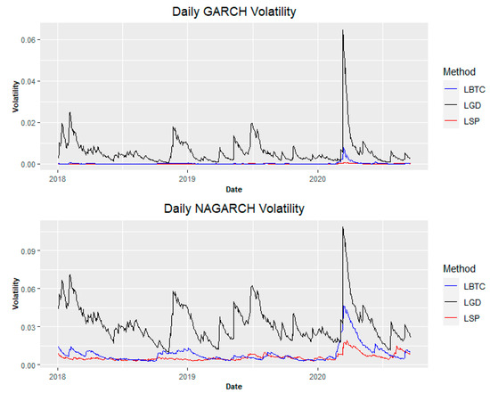 Daily volatility plots for LBTC, LSP, LGD with GARCH (1, 1), and Nonlinear Asymmetric-GARCH (1, 1).