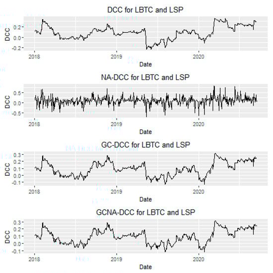 Log-likelihood is a measure of model fit. The higher the value, the better the fit. This is usually obtained from statistical output. For the pair of LBTC and LSP, the log-likelihood values of the DCC and NA-DCC models are smaller than the values of GC-DCC and GCNA-DCC in Table 8. Therefore, we can say that GC-DCC and GCNA-DCC are better models than DCC and NA-DCC to show relationship of Bitcoin with Gold and S&P 500 in terms of log-likelihood. In addition, there is a computation difficulty to compute NA-DCC with LBTC and LGD. Therefore, we can conclude that our proposed method is a better statistical method to look at the relationship among financial assets compared with DCC and NA-DCC. In addition, the estimates of alpha and beta for GC-DCC and GCNA-DCC are statistically significant at the 5% significance level but the estimates of alpha and beta for DCC and NA-DCC are not statistically significant at the 5% significance level. We can see that there is a computation difficulty to apply DCC and NA-DCC to high volatility financial data. The standard errors of the estimates from the DCC and NA-DCC models are much smaller than the standard errors from GC-DCC and GCNA-DCC. Especially, NA-DCC for Bitcoin and Gold cannot be computed from the “fGarch” R package [34] even though the log-likelihood value of DCC is larger than GC-DCC and GCNA-DCC. Based on these results, GC-DCC and GCNA-DCC are better models than DCC and NA-DCC. It is a strong motivation to apply the Gaussian copula DCC models for cryptocurrency to US stock and Gold market prices. We also investigate the relationship of the volatilities of cryptocurrency and US stock market with the GC-DCC or GCNA-DCC.
