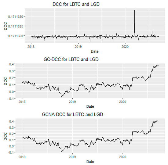 Figure 4 shows the plots describing the three models of DCC, GC-DCC, and GCNA-DCC for log-returns of Bitcoin and Gold. From the patterns of GC-DCC and GCNA-DCC in Figure 4, we also found that there exists a postive time-varying correlation between LBTC and LGD from March 2020 to September 2020 which is the COVID-19 pandemic period.