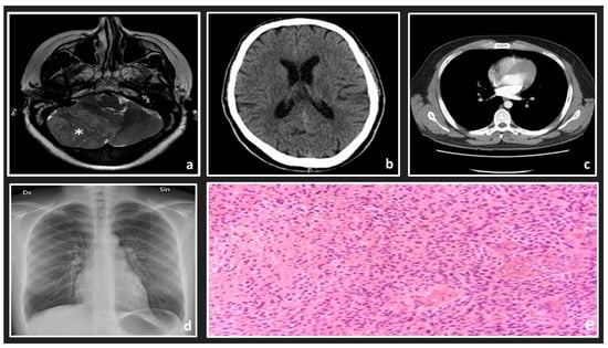 Examples of some medical image types: (a) MRI scan of the left side of a brain; (b) an axial CT brain scan; (c) an axial CT lung scan; (d) chest x-ray; (e) a histology slide with high-grade glioma.