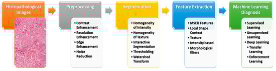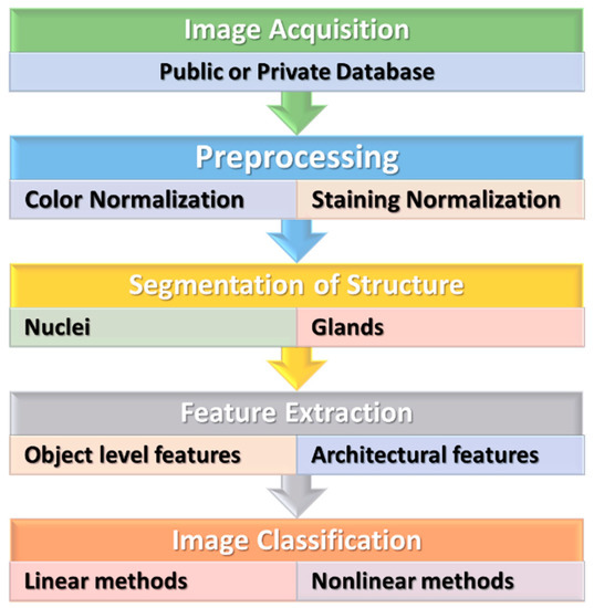 CAD systems played an essential role and have become an important research topic in HI and diagnostics. Various image processing techniques were applied to examine the disease’s diagnosis and prognosis for these HIs. Various image processing and computer vision (CV) techniques have been implemented for gland and nuclei segmentation, cell kind recognition, or classification to extract quantitative measurements of disease characteristics from HIs and automatically assess whether or not a disease exists inside examined samples. It could help to determine the degree of seriousness of the disease, whether present in the sample. Conventional ML methods often contain a few steps to manage HI, as shown in Figure 3. Each step is illustrated in the following sections.