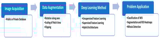 Multiple criteria can be considered when using the DL techniques to deal with histopathology, since accomplishing the method is partly due to the task-species setting. Among the principal features of HI is that appropriate styles be determined by the magnification stage. The key factors are the size of the patch given to the network, the localization of parts in the image where appropriate histopathology originals can be found, and the homogeneity of staining for WSI [72]. The network structure represents an important position, while many studies keep predefined system structures, as illustrated in Figure 4.