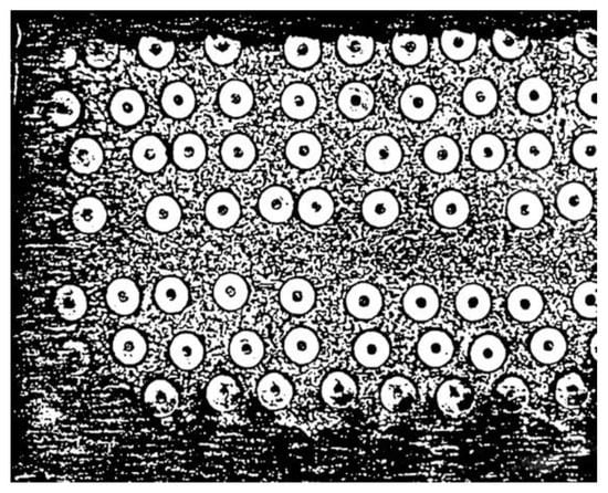 Transverse cross-section of a SiC/Ti-15-3 composite.
