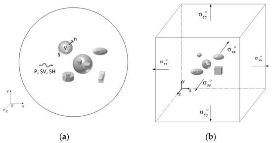 Various analytical methods are accessible for solving inhomogeneity problems when the geometry of the inhomogeneities is straightforward (e.g., ellipsoidal, cylindrical and spherical) or when the inhomogeneities are separated well from one another [,,]. We cannot apply these methods to realistic models for a general problem when the inhomogeneities or voids are of arbitrary shape and the density of the voids or inhomogeneities is high. Therefore, stress analysis of heterogeneous solids frequently requires the utilization of numerical techniques in view of the finite element method (FEM) or the boundary integral equation method (BIEM or BEM). These techniques experience challenges in dealing with problems which include infinite media or multiple anisotropic inhomogeneities. In response to this concern, it has been shown that the volume integral equation method (VIEM) can eliminate both of these limitations in heterogeneous problems which include infinite media [,].