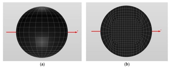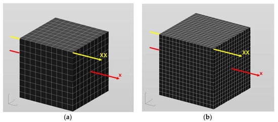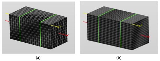 A typical single cubic model (−4 mm ≤ x, XX ≤ 4 mm) (between two green lines) including the outside of the cube (−8 mm ≤ x ≤ −4 mm and 4 mm ≤ x ≤ 8 mm) in the VIEM. (a) A single cubic model (−4 mm ≤ x, XX ≤ 4 mm) with 1000 elements (Model_10 × 10 × 10) (between two green lines) including the outside of the cube (−8 mm ≤ x ≤ −4 mm and 4 mm ≤ x ≤ 8 mm). 1000 elements are used for the discretization of the outside of the cube; (b) a single cubic model (−4 mm ≤ x, XX ≤ 4 mm) with 4096 elements (Model_16 × 16 × 16) (between two green lines) including the outside of the cube (−8 mm ≤ x ≤ −4 mm and 4 mm ≤ x ≤ 8 mm). 4096 elements are used for the discretization of the outside of the cube.