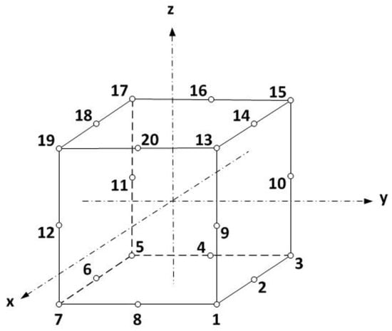 Standard 20-node quadratic hexahedral elements in Figure 6 were used in the VIEM models. In the Model_nxnxn, the symbol n represents the number of line segments split in each side of a cube. A cubic inhomogeneity (−4 mm ≤ x, y, z ≤ 4 mm) is divided into n3 hexahedral elements in the Model_nxnxn. For example, in the Model_14 × 14 × 14, a cubic inhomogeneity (−4 mm ≤ x, y, z ≤ 4 mm) is divided into 2744 (=143) elements.