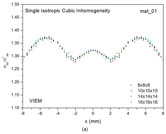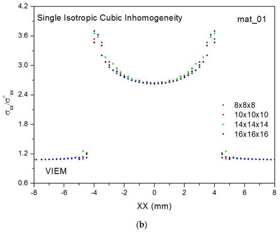Figure 9a shows the normalized tensile stress component (σxx/σoxx) along the x-axis inside the isotropic cubic inhomogeneity (−4 mm ≤ x ≤ 4 mm) and outside the isotropic cubic inhomogeneity (−8 mm ≤ x ≤ −4 mm and 4 mm ≤ x ≤ 8 mm), respectively. Figure 9b shows the normalized tensile stress component (σxx/σoxx) along the XX-axis inside the isotropic cubic inhomogeneity (−4 mm ≤ XX ≤ 4 mm) and outside the isotropic cubic inhomogeneity (−8 mm ≤ XX ≤ −4 mm and 4 mm ≤ XX ≤ 8 mm), respectively. The results using the VIEM for the different models converged very well within this range of hexahedral elements.