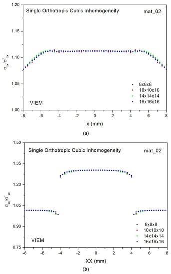 Figure 11a and Figure 12a show the same as Figure 10a for the orthotropic cubic inhomogeneity #2 and #3 (mat_03 and mat_04 in Table 2) (−8 mm ≤ x ≤ 8 mm), respectively. Figure 11b and Figure 12b show the same as Figure 10b for the orthotropic cubic inhomogeneity #2 and #3 (−8 mm ≤ XX ≤ 8 mm), respectively. The results using the VIEM for the different models converged very well within this range of hexahedral elements.