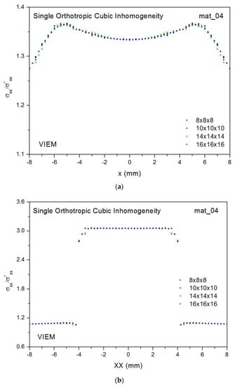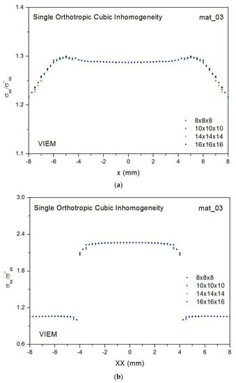 Figure 10 a shows the normalized tensile stress component (σxx/σoxx) along the x-axis inside the orthotropic cubic inhomogeneity #1 (mat_02 in Table 2) (−4 mm ≤ x ≤ 4 mm) and outside the cubic inhomogeneity (−8 mm ≤ x ≤ −4 mm and 4 mm ≤ x ≤ 8 mm), respectively. Figure 10b shows the normalized tensile stress component (σxx/σoxx) along the XX-axis inside the orthotropic cubic inhomogeneity #1 (−4 mm ≤ XX ≤ 4 mm) and outside the cubic inhomogeneity (−8 mm ≤ XX ≤ −4 mm and 4 mm ≤ x ≤ 8 mm), respectively. The VIEM solutions using the different models converged very well within this range of hexahedral elements.