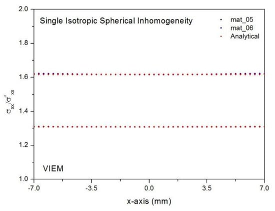 Figure 14 shows a comparison between the numerical results using the volume integral equation method (VIEM) and the analytical solutions [] for the normalized tensile stress component (σxx/σoxx) along the x-axis inside the isotropic spherical inhomogeneities with a radius of 7 mm under uniform remote tensile loading. The remote applied load was assumed to be σoxx = 150.0 GPa.
