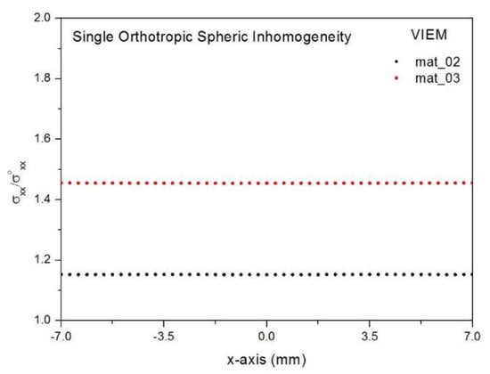 Figure 15 shows the numerical results using the volume integral equation method (VIEM) for the normalized tensile stress component (σxx/σoxx) along the x-axis inside the orthotropic spherical inhomogeneities (the orthotropic inhomogeneity #1 and #2; mat_02 and mat_03 in Table 2) with a radius of 7 mm under uniform remote tensile loading. The remote applied load was assumed to be σoxx = 143.1 GPa. It should be noted that the normalized tensile stress component (σxx/σoxx) inside the orthotropic spherical inhomogeneities was found to be constant [].