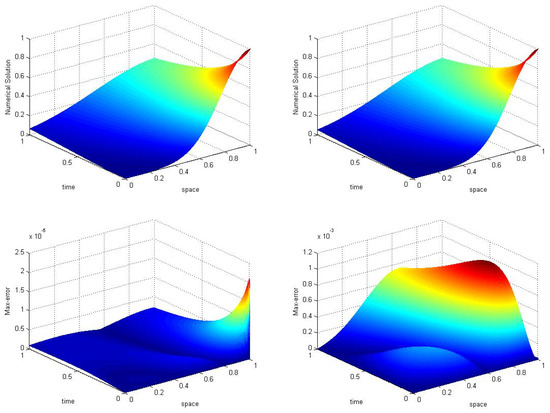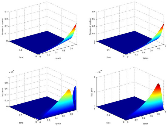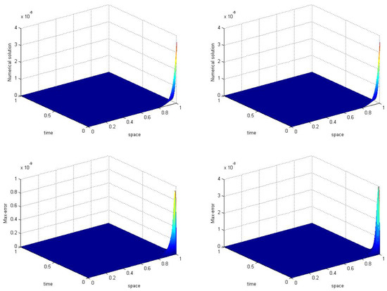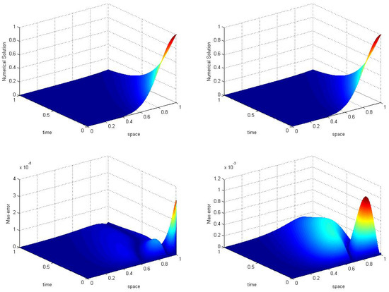 Numerical solution and max-error of modified FVM (left) and existing upwind FVM (right) for diffusion dominant phenomenon taking ( = 1/320 , for numerical example 2).
