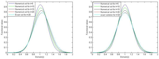 Figure 7 shows the numerical approximation (for numerical example 2) of the convection–diffusion problem using the modified upwind finite volume method with different time levels. Numerically, we have tested the modified scheme for convection dominance (see left of Figure 7) and for diffusion dominance (see right of Figure 7). Both figures indicate that the increase of the time level for a numerical solution using our proposed numerical scheme get closeness to an exact solution.