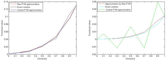 In Figure 8 and Figure 9 numerical approximations using new form of finite volume method and the most central difference scheme of FVM are compared for different cases of convection dominance. When we compare the max-errors of both numerical schemes, in the first case (when and ) the max-errors produced by new FVM scheme and central (FVM) scheme are and respectively. For the second convection dominance case () the new scheme gives max-error and the central scheme gives . This implies that, for both cases, this newly constructed FVM scheme gives highly accurate results and it has the good capability to deal with convection dominance as compared to the central scheme of finite volume method.