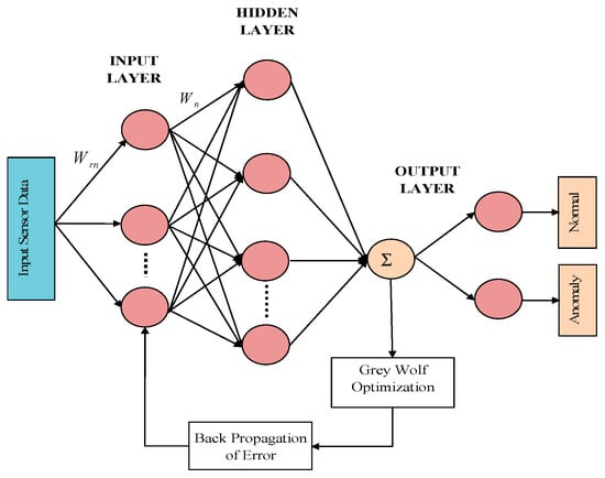 An artificial neural network (ANN) is the algebraic equivalent of the human brain, used for complex pattern recognition []. ANN classification uses a three-layered, feedforward artificial neural network, where the sets of input neurons are mapped onto a set of computational outputs and a training algorithm (usually a backpropagation (BP) algorithm). The structure of an ANN consists of one input layer, one output layer and one or more hidden layers. Every layer is composed of various neurons or nodes interconnected by weights. Generally, the data sent as input to ANNs are trained, with or without providing the target output. The output pattern is registered by varying the weights to reduce the error between the actual and desired output patterns. The training process ends once the error is minimized to the desired range. Our proposed anomaly detection scheme takes the data from wearable sensor devices and processes this data to sort the output classes of data as normal or anomalous. Moreover, the proposed ANN-based anomaly detection scheme uses a GWO algorithm to optimize the weights by minimizing the training error. This improves the accuracy, training speed and performance of the existing BP algorithm. The structure of the proposed GWO-based modified ANN is shown in Figure 2.