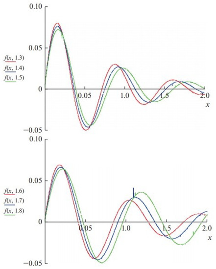 It is easy to show [6] that is not with a fixed sign, and this fact says that Equation (7) was incorrectly chosen as the oscillatory equation. Physically, it is clear that the order of the operator is close to 2 (or when is close to 2), then the operator has the main oscillatory properties. We have the following result.