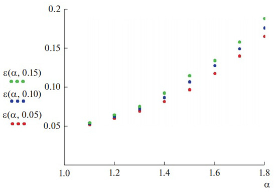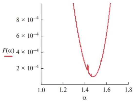 Finally, using these data, we construct the deviation function (40) presented in Figure 4. The constructed graph shows that the deviation function has the minimum for , and it allows us to assume that the order of the fractional derivative in Expression (31) is equal to 1.47. Figure 5 presents the experimental points and the theoretical curve. Comparing the experimental data presented in Table 1 with the model allows us to draw a conclusion that the provided model is adequate and our techniques for parametric identification have a high level of accuracy. The knowledge of the parameter in the model (31) allows us, in particular, to predict various stress–strain characteristics of the material (polymer concrete, asphaltic concrete, etc.) when subjected to loading.