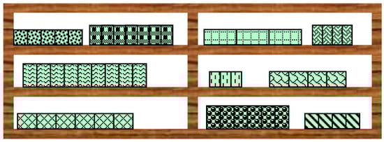 In this research, the product quantity parameter is not only facing because, in a real retail store, the product package can also be capped, nested, or neither capped nor nested. If the products’ packaging allows one product to be placed on top of a lower product in another rotated orientation, then it is called capping. Most rectangular boxes, such as boxes with teas or sweets, can be capped. In a real store, the capping can be rotated by 90–360 degrees, but because we investigated the planogram one-dimensionally, we considered only one possible orientation for capping. When the product’s packaging allows it to be placed inside another one, as in the case of bowls or plates, it is called nesting. Figure 3 and Figure 4 present the cap and nest allocation technique. It is assumed that in one front-orientated capped group, the number of facings is . For one side-orientated capped group, the number of facings is .