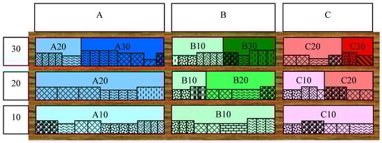 Figure 2 shows the rules of allocating products to vertical categories A, B, and C and numeric price subcategories on the planogram. The darker the color of the category, the more expensive the product is, so they cannot be allocated to the lower shelves. In contrast, cheaper products have light colors; they can be allocated to lower and upper shelves (at eye-level). The products with medium–light colors must be allocated to no lower than the middle shelf. Products of the same category must be grouped and located together in their vertical category on the planogram.