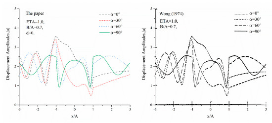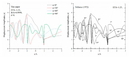 Figure 3 depicts the comparison between the results obtained under conditions , , and and the results of a semi-elliptical canyon. The general trend is that our numerical results are consistent with those given by Wong [13]. Due to the geometric generality of the ellipse, when tends to infinity, the semi-elliptical canyon tends to a semi-circular one. At this time, our numerical results can be compared with the results obtained by Trifunac [12]. The displacement amplitudes for , , and when , , , and are presented in Figure 4. It can be clearly seen that their trends are almost the same. After careful comparison, it can be seen that the maximum value of the displacement difference is only very small: less than 1%. The above differences may be due to the different functions used in each problem on the one hand, and because the axis ratio of the ellipse is 0.99 instead of 1 on the other hand. The results in other cases are equally consistent but are not listed here for brevity. Thus, the accuracy and usability of the method proposed in this paper were verified.