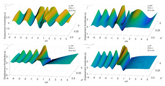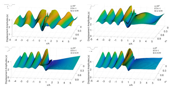 First at all, we calculated the displacement amplitude of the elliptical-arc canyon that approximates the circular-arc canyon (). Figure 5 illustrates the displacement amplitudes for an almost-circular elliptical canyon () and the dimensionless parameter equal to 1. Additionally, the figure shows three-dimensional plots of displacement amplitudes at different incident angles , , , and vs. the distance x/A on and around the canyon and the dimensionless distance varying within the range [0, 0.9]. It can be seen that when the waves are oblique incidence and grazing incidence, the ground motion near the illuminated surface of the canyon terrain produces violent fluctuations. Obviously, this is due to the reflection of the canyon’s illuminated surface against the waves. In the area of , due to the barrier effect of the canyon terrain, the ground motion is significantly weakened, and the response is also very smooth. As the value of increases, the barrier effect of the canyon terrain still exists, but the movement of the entire surface tends to be gentle, and the amplitude of the response becomes smaller.