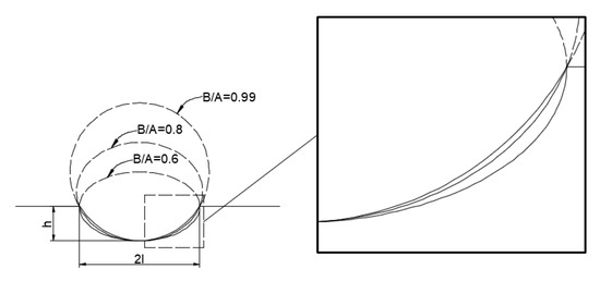 To further demonstrate the novelty of this model and method, examples of different elliptical-arc canyons with the same depth-to-span ratio are presented. As shown in Figure 7, although these canyons have the same depth-to-span ratio, they belong to different ellipses. The scattering of SH waves by these canyons with the same depth-to-span ratio and belonging to different ellipses and the differences between them are exactly what can be solved by the method and model in this paper.