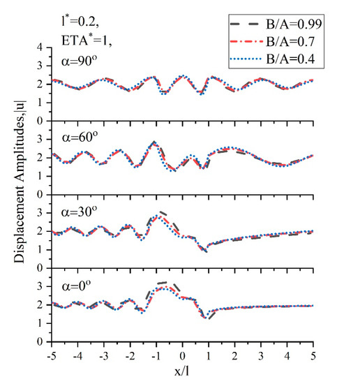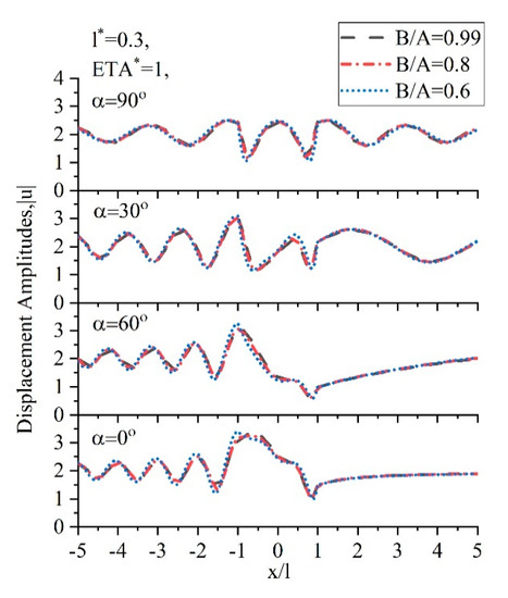 Since the ellipse where the elliptical-arc canyon is located is different, the value of is different under the same wavenumber, so we further define the dimensionless parameter and the depth-to-span ratio . As shown in Figure 8, under the conditions of and , the comparison of displacement amplitudes of canyons with an axis ratio of 0.99, 0.8, and 0.6 are presented. It should be noted that when , the elliptical-arc canyon is exactly a semi-elliptical canyon, and when , the elliptical-arc canyon is an almost circular-arc canyon. It can be obviously found that the variation trends of the displacement amplitude under different axial ratios are substantially consistent at the same incident angle. However, the maximum value of the displacement amplitude and the position of the maximum value are obviously different, which is obvious when , and not so obvious when . This can be observed at even more obviously, as shown in Figure 9. Therefore, the difference between the scattering problems caused by the elliptical arc canyon with the same depth-to-span ratio and different axis ratio is worth noting.