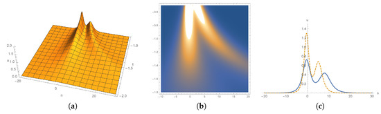 When , solution (38) is nonsingular. Figure 5 and Figure 6 depict soliton–soliton interaction, respectively, and soliton–anti-soliton interaction of the nsd-mKdV Equation (4) with .