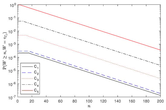 By Theorem 2, we can compute the conditional mean of the sooner waiting time W, , , and the unconditional mean of W, . Table 6 shows the conditional and unconditional mean waiting times for Example 1.