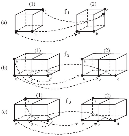 Second, motivate by the maps in (1) above, we easily establish certain 18-continuous self-maps of in Figure 5b(see (1) →(2) and (1) →(3)) such that .