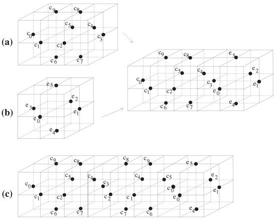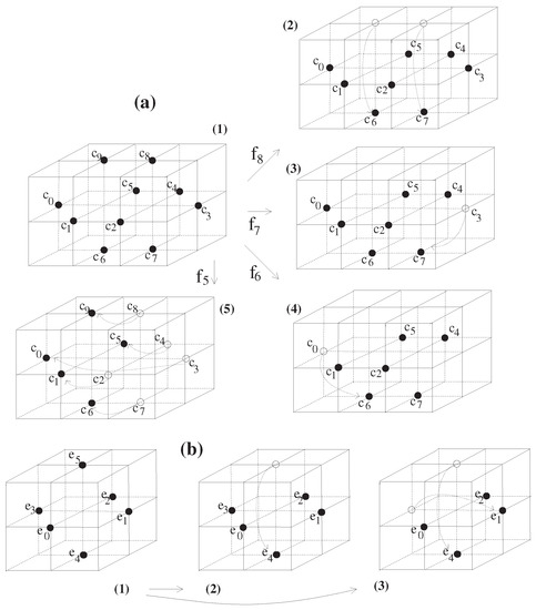 Similarly, motivated by the establishment of , we obtain an 18-continuous self-map of in Figure 5a satisfying . Furthermore, as only a digital image with a singleton has the fixed point property [11,15,26], it is clear that . Based on these cases, we obtain , which completes the proof.