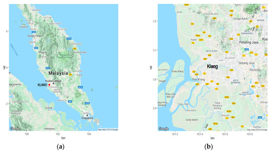 (a) Map of peninsular Malaysia (the location of Klang is marked by the red dotted point); and (b) map of Klang.