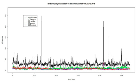 The air pollution problem has long been the centre of discussions all over the world. This issue is particularly alarming for the urban areas of developed and developing countries [1,2,3]. In Malaysia, air pollution is generally determined from five major types of pollutants, namely, carbon monoxide (CO), suspended particulate matter (PM10), sulphur dioxide (SO2), ozone (O3), and nitrogen dioxide (NO2) [4,5]. These five pollutant variables are observed simultaneously and monitored constantly to provide relevant information about air quality [6]. As these pollutants are simultaneously being observed and monitored, the investigation into the relationship and correlation among these five pollutant variables is expected to contribute to a comprehensive understanding of the behaviour of air pollution events at any particular area. For example, Marković et al. [7] have investigated the behaviour of CO, O3, NO2, SO2, and PM10 in the Belgrade urban area during the autumnal period of 2005. They reported the existence of a positive correlation between the PM10 SO2, NO2, and CO. On the contrary, the O3 variable was found to indicate a negative correlation with SO2, NO2, PM10 and CO. With the basis of the correlation measured, they contended that SO2, NO2, CO, and PM10 could originate from similar sources. Rich et al. [8] found a high association between myocardial infarction disease and particulate matter concentration in the presence of other pollutants, such as O3, CO, SO2, and NO2. The analysis by Xie et al. [9] for 31 Chinese cities showed the following: the correlation between particulate matter and NO2 and SO2 is either high or moderate, the correlation between particulate matter and CO is diverse, and the correlation between particulate matter and O3 is either weak or uncorrelated. These results varied spatio-temporally across all the cities.