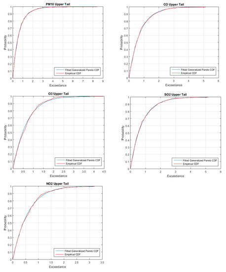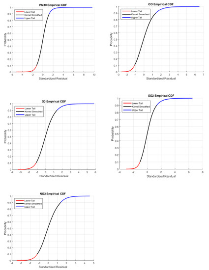 Figure 3 shows a comparison of the empirical and GPD plots for the cumulative distribution function (CDF) of the exceedance of the residuals in the upper tail of each pollutant variable. The fitted GPD closely follows the exceedance of the residuals, although only 10% of the standardized residuals were employed. Thus, the GPD model is a suitable choice for the upper tail data of each pollutant. This result is also valid for the lower tails. On the basis of the GPD model, the overall CDF of the semi-parametric models is obtained (Figure 4). In particular, the lower and upper tails are determined by the fitted GPD model while the interior part is estimated by the GARCH model.