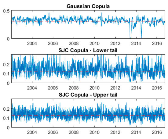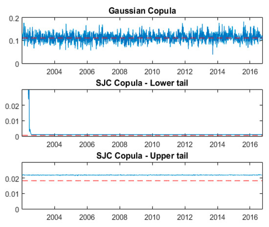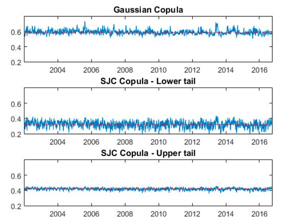 To further investigate the dynamic dependence structure among the pollutant variables, we present in Figure 5, Figure 6, Figure 7 and Figure 8 the time paths for the overall, lower, and upper tail dependencies based on the Gaussian and SJC time-varying copulas. In each figure, the red dashed line denotes the dependence parameter for the constant copula while the solid blue line denotes the dynamic parameter values under the time-varying copula. As mentioned previously, the time variations of the dependency measures between the pollutant variables are described by the parameters of , ,, , and . Then, as shown in Table 4, the results of the time-varying Gaussian copula model reveal that most of the time paths are close to a white noise series as the values of the variation coefficient α are relatively higher than those of the persistence coefficient β, except for the PM10–NO2 relationship. For the time-varying SJC copula, all the persistence coefficients β are larger than the coefficients α for all pairs. This result gives some insights into the changes of the dependence structure for the upper and lower tails over a time period.