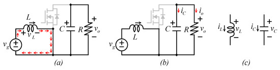 The (boost) power stage (a) topology, (b) equivalent circuit of the converter when the switch is closed (on), (c) equivalent circuit of the converter when the switch is open (off).