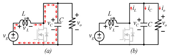 The circuit’s operation can be explained in the following manner. There is a switching function s1, that drives the operation by closing and opening transistors (which are electronic switches). When the transistor s1 closes, the circuit behaves like the equivalent circuit shown in Figure 1b, in which the transistor was substituted by wire since it operates as a wire when it is closed, allowing the current to flow, the transistor position is indicated in gray, but it is off and is not draining any current, since it is open. Similarly, when the transistor s1 opens, the circuit behaves like the equivalent circuit shown in Figure 1c.