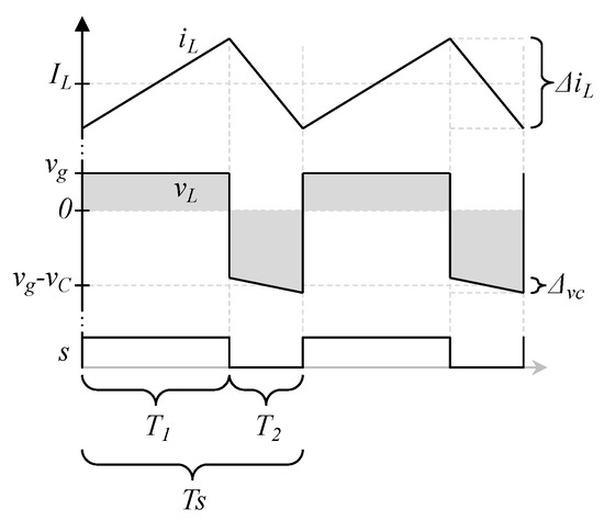 Being T1, the time in which the transistor is closed, and T2 the time in which the transistor is open, it is considered that TS = T1 + T2, and by using the aforementioned definition of the duty cycle, it would be defined as d = T1/TS. Equation (6) can be explained with Figure 4; at the bottom of Figure 4, the switching function s is a digital function that indicates when the transistor is closed or open, when the transistor is closed (s function is high), the voltage across the inductor is equal to vg (see Figure 2). In the other case, then the transistor is open (s function is low), the voltage across the inductor is vg − vC (see Figure 3). The average voltage across the inductor is marked as gray. From Figure 4, the average voltage across the inductor can be expressed as (6). In Equation (6), the area under the curve is calculated and then divided over the total switching period Ts.