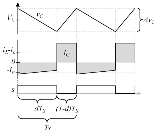 Similarly to Equation (6), Equation (8) can be explained with Figure 5; at the bottom of Figure 5, the switching function s is a digital function that indicates when the transistor is closed or open, when the transistor is closed (s function is high), the current through the capacitor is io, it is discharging the capacitor, and then it is considered negative (see Figure 2). In the other case, then the transistor is open (s function is low), the current through the capacitor iL − io (see Figure 3). The average current through the capacitor is marked as gray. From Figure 5, the average current through the capacitor can be expressed as (8).